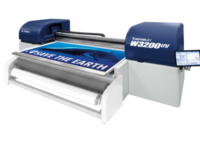 Screen’s Truepress Jet W3200UV with an artists impression of the new roll-to-roll option.