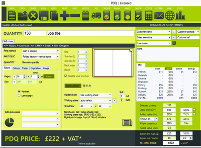 It is a smart little desktop tool that Mr Roche also describes as one of the industry’s best-kept secrets. It can be used as a standalone system for estimating, or be linked directly into an MIS system, so that job details from a successful estimate automatically populate job tickets and move all the way through to invoicing. Mr Roche told Digital Printer: ‘That back-of-afag- packet estimation that the sales guy did, PDQ allows you to do in total confidence.