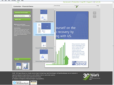 As with the Brand Manager, the Web-to-Print system is based on templates set up in QuarkXPress, with the option to allow or prevent editing of specific items. This might be to protect brand identities as with the Brand Manager, but it might equally be used for business-to-consumer applications, to set up libraries of professionally designed business cards, stationery, banner ads and the like, where the customer can only change