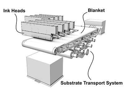 The white paper highlights how Nanography differs from other printing technologies. It employs Landa NanoInk colorants, proprietary water-based inks with ‘nanopigment’ particles that are merely tens of nanometers in size. These are sprayed by inkjet heads (Landa calls these ejectors) onto a moving, heated blanket. The heat drives off the water leaving adhesive ink particles that are then brought into contact with the substrate. The ink s effectively dry as soon as it is applied. This means that normal offset papers can be used, as well as plastics and packaging materials.