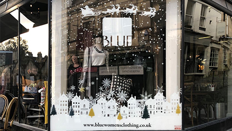 Retailer Blue has had its Bath storefront decorated in a seasonal theme with window graphics produced by the Drytac Academy.