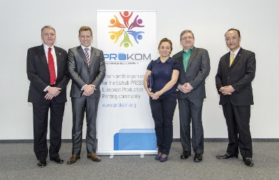 Prokom board members Andy Barber, Sara Grande and Harald Büttner are flanked by Konica Minolta’s Etienne Van Damme (left) and Ken Osuga at the official…