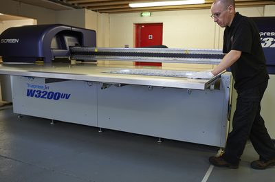 Operator Paul Newman loads a test sheet onto the Truepress Jet W3200UV JCT Visual Communications has chosen Screen Europe’s newest wide format printer, the Truepress…