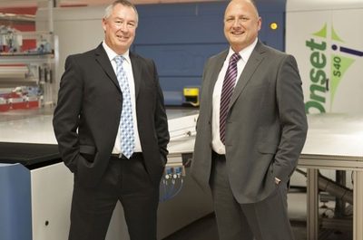 Mike Norris, business development manager, Fujifilm UK (left) with Richard Blueitt, commercial & operations director at Superior Creative Superior Creative has invested in an Inca Onset…