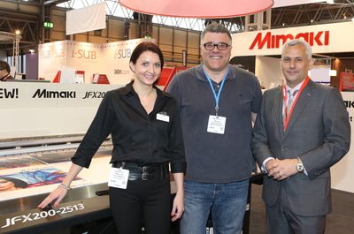 (L-R) Emma Plant, I-Sub Digital, Paul Fox, Graphic Station and Peter Mitchell, Hybrid Services Ltd The first worldwide sale of Mimaki’s JFX200-2513 UV LED flatbed printer…