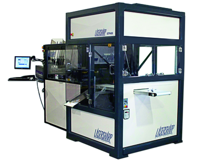 This is a Lasersharp STS with 400W laser cutter, fitted with a vacuum transport belt unit and stacker. It can run with a sheet or roll feeder, or be integrated inline with a press, creaser and folder-gluer