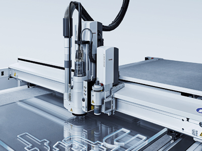 Digitally controlled cutting tables, also called finishing or plotting tables, are usually associated with large format printing rather than commercial work. However there are some small models of about B2 size, notably from Mimaki, while larger models with automatic registration (as supplied by AXYZ, DYSS, Esko Kongsberg, Valiani, Zünd and others) can handle several sheets at once with no need for precise positioning on the bed. They are slower than physical die-cutters, but have the advantage that they don’t need dies. They’re also usually slower than lasers, but have the advantage of greater versatility – in particular they can form proper creases and can often do shaped routing and v-cuts of thicker materials.