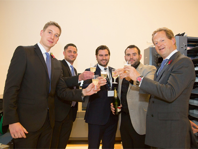 Duplo executives including managing director Peter Jolly (left) and chairman Robin Greenhalgh (right) celebrate with Rapidity’s Paul and Ben Manning (centre and centre right).