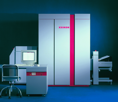 Xeikon’s DCP-1 press was a web fed full colour toner printer, with single-pass duplex printing in CMYK. It took a 320 mm web and ran at 17.5 duplex A3 sheets per hour at 600 dpi, equivalent to 35 A4 pages per minute (today’s fastest 8800 model runs at 260 pages per minute at 1200 dpi).