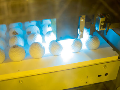 Using jigs makes it easy to print many items in one go, such as this Mutoh VJ-426UF printing golf balls