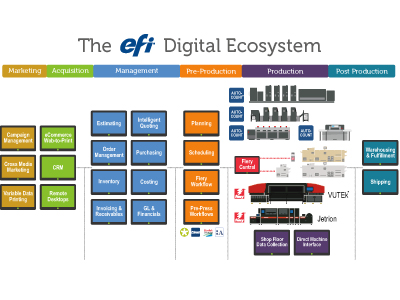 To support this model, EFI has organised its software range into four areas based around business functions common to all print enterprises: new revenue generation; efficiency and profitability; pre-production; and production; all of which link into EFI’s core MIS/ERP platforms.