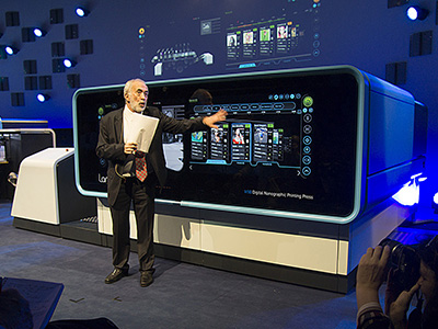 Mr Landa was famous for his drupa and Ipex presentations at Indigo. For his new company he managed to go even further over the top, with a 40 minute show including modern dancers, pounding music and Mr Landa appearing miraculously in a spotlight to treat the audience to his vision of the future.