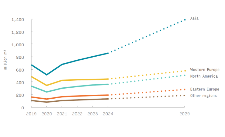 Looking ahead, Smithers forecasts a compound annual growth rate (CAGR) of 7.9% in volume demand over the next five years, with annual output reaching 2.9 billion square metres by 2029. Value growth is expected to grow at 6.6% CAGR, reaching $15.2 billion (£11.7 billion) by the same year.