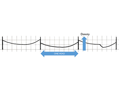 The density of output across an inkjet printhead can vary leading to a ‘smile’ profile (see picture above), the effect is made worse in multi-head print arrays and over time as individual heads are replaced in printer designs that permit this. Product manager Tom Mooney explained, ‘We correct for this in software, not via voltage control, in real time. This gives fine granularity and allows the use of the same voltage across all printheads, maximising their lifespan.’