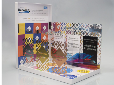The DecoBox includes several offerings for interior decoration including KernowJet FloorSharK, a PVC-free R10 Certified floor graphic film that does not need to be laminated; a printed wall of KernowJet Interiors non-woven wallcoverings in 13 different finishes; mini displays of KernowJet Supreme and Ultimate roll-up and pop-up display solutions; and KernowJet Opaline for backlight which can be illuminated with the mobile phone light to show the colour gamut of the product. The swatchbooks of all available wide-format products are included in the DecoBox.