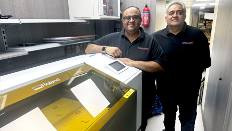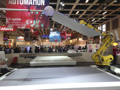 A highlight of Canon’s stand at Fespa was a fully robotised print-and-cut workflow linking the Océ Arizona 6170 flatbed printer with the Océ ProCut cutting table.