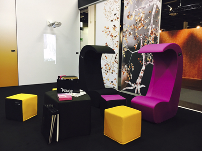 Chairs and cubes covered with sound absorbing digitally printed fabric by PONGS Textiles, one of the exhibitors and speakers at PID 2018