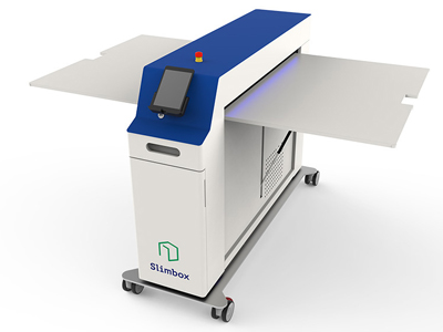The Slimbox is set up and operated via a PC or smartphone based app. A cardboard measuring tool helps set the dimensions of the product to be packaged. These are then entered via the app for the cutting shape to be sized appropriately. Cardboard sheets can be between 1 and 5mm and up to 30 boxes per hour can be created.