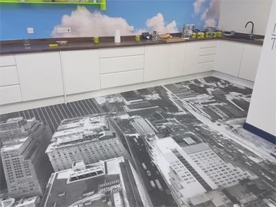 The kitchen area of Strukta Group has been updated with floor graphics featuring a bird’s eye view of New York. Using an Océ Arizona 550GT wide format press, the design was printed onto Udeco Crystal Floor – a soft PVC floor graphic material with the design printed on the reverse for a more durable top layer.