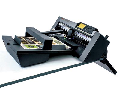A pneumatic air-driven lever lifts sheets from the loading-feeding tray and inserts them into the plotter. Speed varies with the complexity of the cut, running with an average of 30-40 seconds for pressure sensitive label sheets.