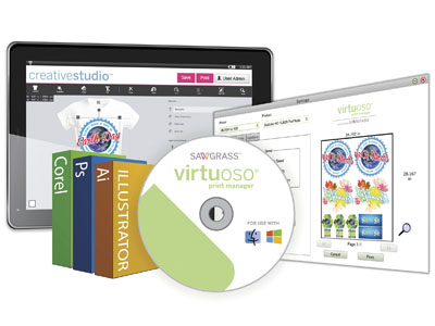 The software works with a variety of Sawgrass printers, ink sets and graphic design programs, including: Windows or Mac OS (for SG400/SG800); CorelDraw, Adobe Photoshop, Adobe Illustrator and CreativeStudio; Virtuoso SG400, SG800, VJ 628 printers; SubliJet-HD CMYK, Pro Photo and Pro Photo XF inks, as well as ChromaBlast-HD and FabricMaker-HD.