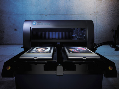 The Storm Hexa twin pallet, 6 colour + white DTG printer from Kornit is almost twice the speed of its predecessor, creates vivid prints with 6-colour, CMYK + red and green ink channels and has an ink recirculation mechanism that increases system uptime and reduces maintenance and ink wastage. It is fitted with on-line pre-treatment and inbuilt climate control.