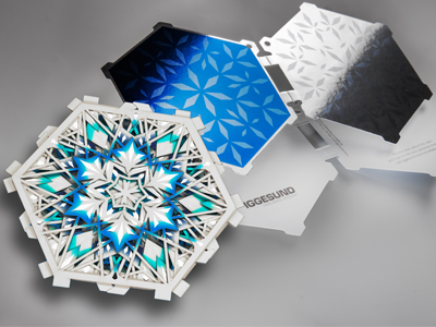 The card consists of seven digitally cut snowflakes with each side printed with a different pattern. These 14 variations can then be folded to create more than 44,000 different patterns. The snowflake then encloses a card made of Invercote Metalprint 359 gsm.