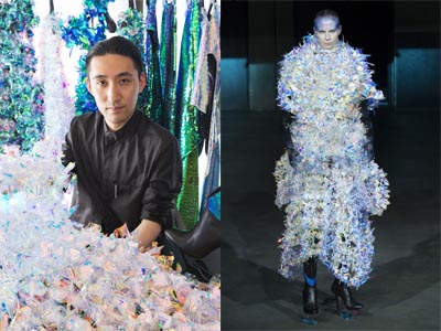 Fashion designer Yuima Nakazato and one of his creations made with Fujifilm technology