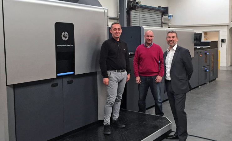 (L-R) Sales director Matthew Evans and managing director Jonathan Padley with John Harrison, account manager HP Indigo