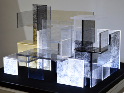 The acrylic glass is half the weight and has twice the transparency of conventional glass and when used in conjunction with LEDs along the edges, Altuglas Signature displays optical effects depending on the power and illumination angle. The range is available in seven textures including grid, mesh and lace, along with a bespoke option using a fabric design.