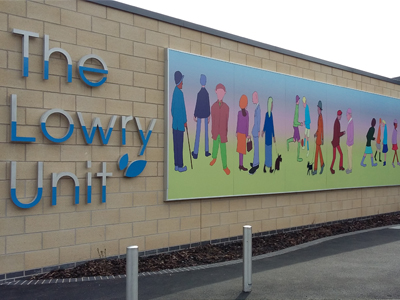 Artist Gerry Halpin MBE integrated laser cut coloured Perspex acrylic and printed Perspex acrylic to create ‘The Lowry Wall’, a 7m-long panel with a sequential colour cycle featuring figures from L.S. Lowry’s paintings. The installation is located on the wall leading to the hospital’s’ Lowry Unit entrance – named after local geography that inspired the famous artist. The majority of individual figures were printed directly onto Perspex Opal panels 3m tall, whilst five figures were printed and then cut out separately to create a raised 3D effect.