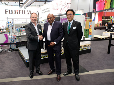 (L-R) Keith Dalton, managing director, Fujifilm UK; Lascelle Barrow, co-founder and director, Augustus Martin; Takashi Yanagawa, senior vice president, Fujifilm Europe, Graphic Systems Division