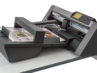 The compact footprint of the cutter enables it to be mounted to a table as small as 60 x 67 cm. Perfect sheet alignment is achieved via crop mark reading for each individual sheet, with a camera equipped with i-Mark technology performing the crop mark adjustments in a fraction of a second. Software algorithms compensate for any distortion from the printing process to enable precise cutting with minimal bleed. There is also an option to cut perforated lines during file creation. Average cutting speed is 30-40 seconds for each sheet and heavier material cutting is possible on board up to 350 gsm.
