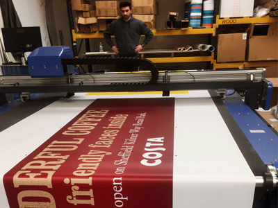 The arrival of the DYSS X7-1630C in February came shortly after the arrival of a 2.5 metre wide Anapurna printer. Commenting on the acquisitions, commercial director Chris Parker said, ‘We bought the Anapurna as it has the option of roll feeding as well as handling rigid sheets, which is ideal for the 12 metre long mesh banners we produce for Network Rail. Furthermore, we print a lot of 50 metre rolls that require subsequent cutting. These rolls would take two members of staff four hours to cut and with our roll print quantities, this would see two men permanently deployed to hand cutting banners. This is why we bought the DYSS.’
