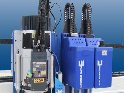 The Trident incorporates a triple head configuration featuring a CNC routing spindle with oscillating and tangential knife cutting units. These are interchangeable to enable the processing of frequently problematical thin materials such as aluminium and other non-ferrous metals and aluminium composites (ACM), acrylic and foamed boards.