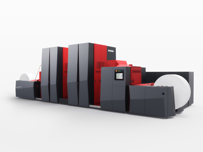 Running at a speed of 60 m/min, the 500 mm wide web fed machine is capable of producing 800 A4 pages per minute on standard coated materials.