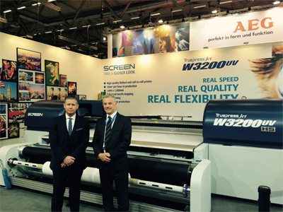 Alan Rigglesford, managing director, celebrated his new investment at FESPA this week: ‘It’s important to our business and our clients that we use the very latest technology to deliver a first rate print/finish/install service. Our production director Graham Leggett spent six months researching all the latest 3.2 m wide printers available before deciding on the Screen Truepress Jet. It handles true flat-bed and true roll-to-roll performance – both at 150 sqm/hr! Quite simply no other printer delivers the same productivity and flexibility.’