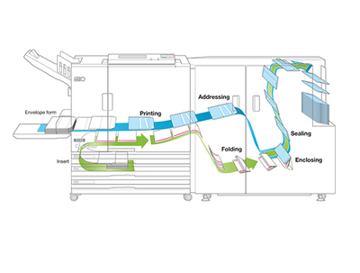 A Riso ComColor 9150 or 7150 printer, in combination with the new Wrapping Envelope Finisher, automatically personalises documents and envelopes, then addresses, folds and assembles them into a completed, sealed mail piece at rates of up to 2,200 completed pieces (single page insert) of mail every hour.