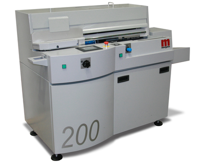 The Morgana Systems DigiBook 200 PUR perfect binder handles spine lengths from 110 to 320 mm and the maximum thickness is 50 mm. Retractable spine milling means that the device can go from soft- to hard-cover binding at the flick of a switch. Side gluing for the cover hinge is adjustable depending upon the cover style required.