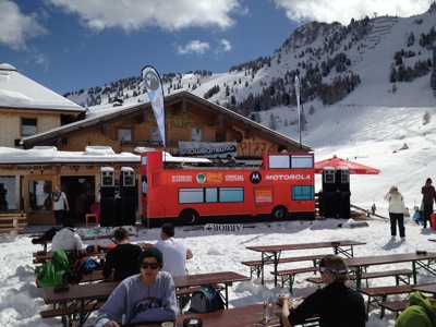 The London Bus at the Snowbombing Festival in Mayrhofen, Austria.