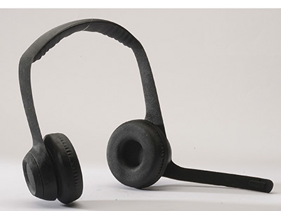 This prototype for a pair of headphones was printed in a single session on an Objet Connex, yet combines several materials: the new  Rigid Black for the sides, Black Objet Digital Materials for Soft-Touch Zones on the ear pads (Shore 40), and a different hardness (Shore 60) for the pad inside the headband.