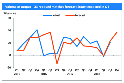 According to the survey, 44% of printers increased their output levels in Q3 of 2018, 33% held steady, and 23% experienced a decline. This provides a balance between the ups and downs of +21, which is just below the +23 forecast in the previous Printing Outlook report. For the final quarter of the year, more than half of respondents (55%) predict that they will increase output levels, with just 18% forecasting a reduction. Should this balance of +37 be realised during Q4 it would be a seasonal boost that was once considered ‘normal’, and last experienced in 2015 – before the EU referendum.
