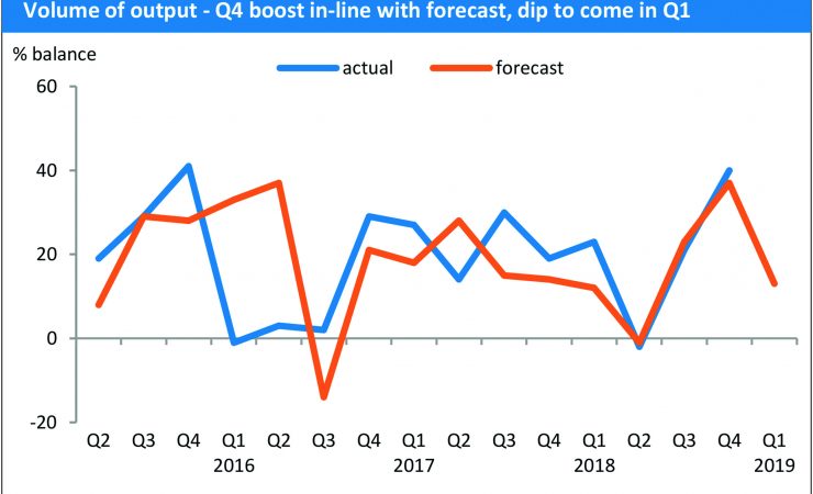 Looking ahead, fewer expect their activity to increase in the first quarter of 2019, though the overall balance is still positive, with just over a third (34%) saying they forecast growth, 45% expecting steady output levels but an increase to 21% of those who anticipate a fall in activity.