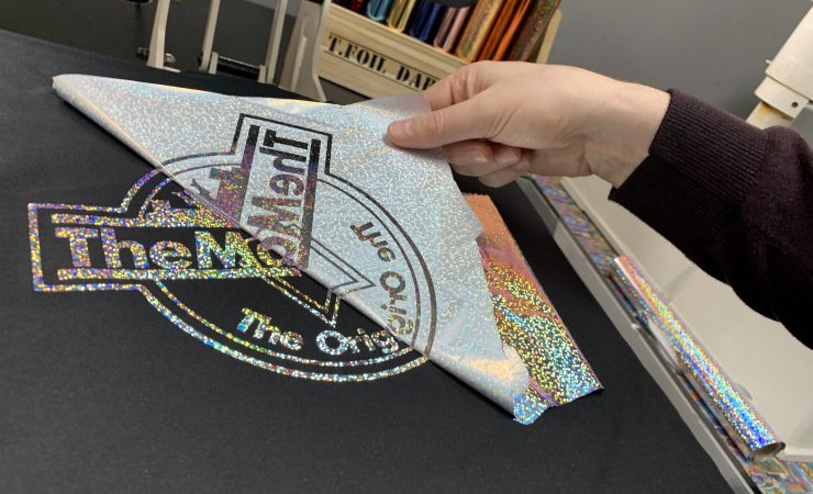 A foil-over-toner process using products from The Magic Touch and Oki desktop printers allows complex designs to be printed cost-effectively with metallic and sparkle effects on T-shirts or other garments, irrespective of garment colour and fabric type.