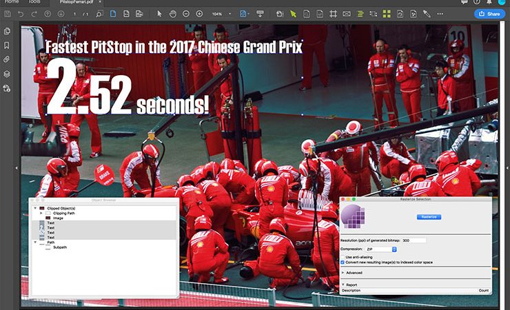 Another much-requested addition is an object browser. This simplifies the process of selecting objects within the PDF that may overlap, be separated by other objects or entirely obscured, via a ‘tree’ view. Selected elements can then be processed using any of the PitStop functions.