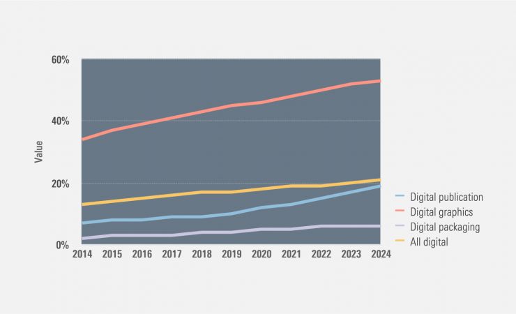 Market research from Smithers Pira estimates that digital print’s share of the total market output has grown from 13.5% in 2014 to 17.4% in 2019 and will account for 21.1% in 2024, taking work from litho and other analogue technologies.