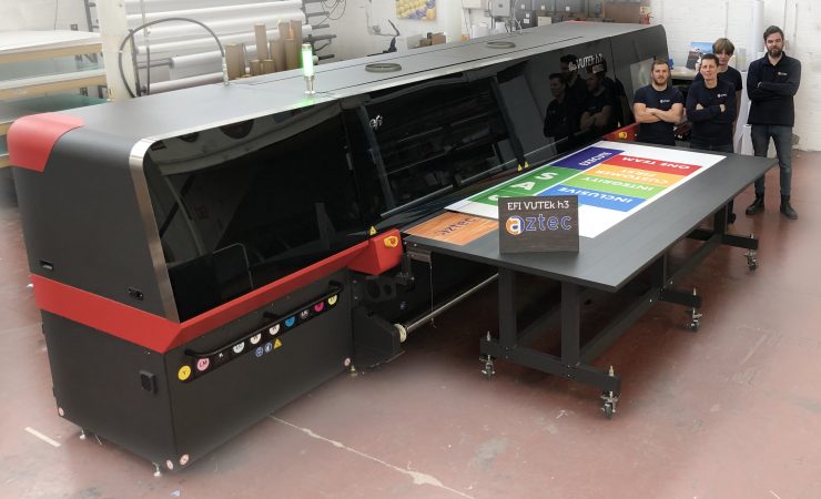 Aztec Signs has purchased an EFI Vutek h3 printer from CMYUK. The 3.2m wide, hybrid, LED printer is central to the Leeds-based company’s plans for the future, allowing it to increase both capacity and quality whilst reducing energy consumption by 82%.