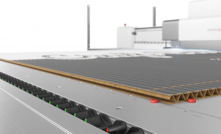 Called Tip Switch Vacuum, the system was introduced with the company’s Karibu roll-fed printer in 2019. It allows rows of vacuum nozzles to be turned on or off simply and intuitively by hand, thus concentrating the vacuum force only in areas where it’s required without leakage elsewhere, helping tame ‘unruly’ media such as corrugated board. It supports twin zone operation as well, where one board can be loaded or removed while the previous one is being printed, working alternately from the front or rear of the printer.