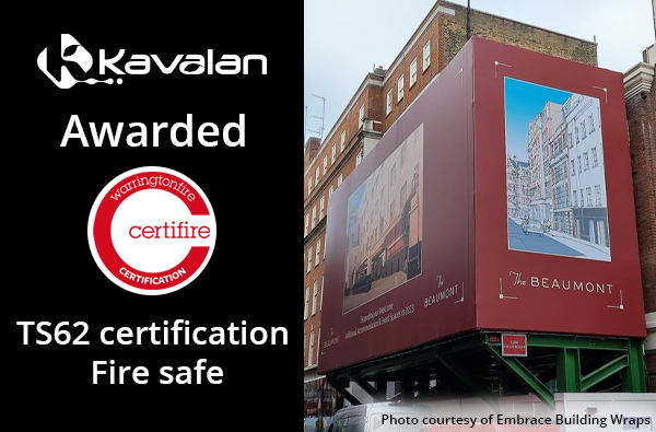 Kavalan’s Sunlight Weldable Frontlit Banner and Spiderweb 300 Mesh Banner have both passed Certifire’s TS62 certification programme.
