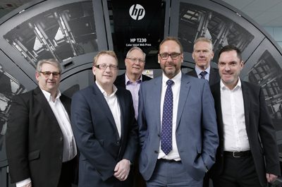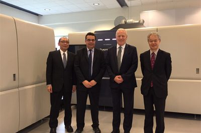 (L – R) Akihito Komori, President, Komori International Europe; Neil Sutton, Group sales director of Komori International Europe; Brian Filler, President, Screen GP Europe; Takanori Kakita, Chairman, Screen GP Europe.…